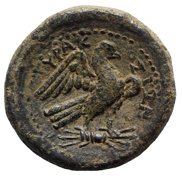 Eagle standing r. on thunderbolt; above ΣYPAK-OΣIΩN