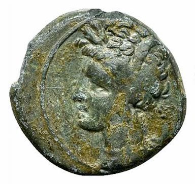 Kopf einer Kore (Tanit) n.l, geschmückt mit Kornähren und Schilf, Fadenkreis