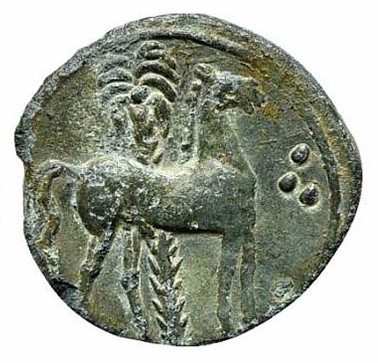 Horse standing right, behind date-palm, in fiel right three pellets, linear border