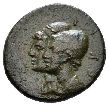 Büste der jungen Dioskuren n.l., ihre Kappen beide mit Sternen., dahinter ein Pflug