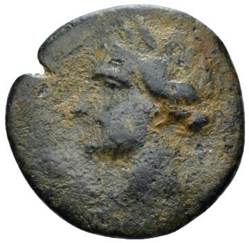Head of Tanit l., wearing earring, necklace and wreath of grain