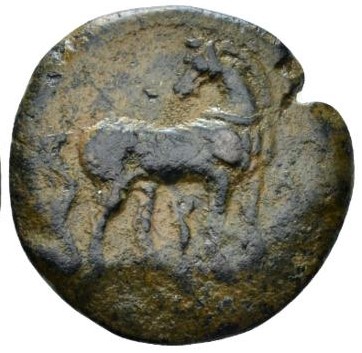 Pferd steht n.r., den Kopf n.l.gewendet; darüber Punkt, zwischen den Beinen punischer Buchstabe