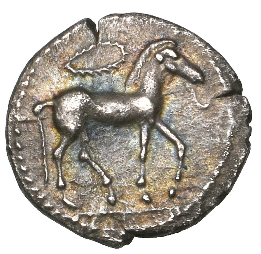 Pferd steht nach rechts, Zügel am Perlkreis angebunden, oben Kranz