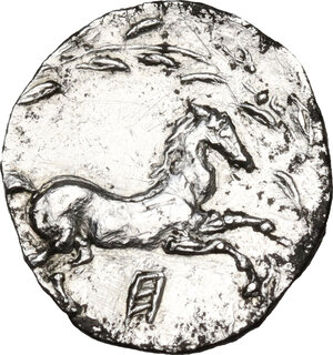 Horse leaping right; Punic H below,all within wreath