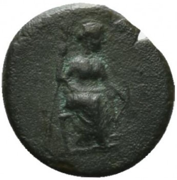 Female figure wearing a long chiton, seated on throne, right.She holds in raised right hand a trident and in lowered left a bow