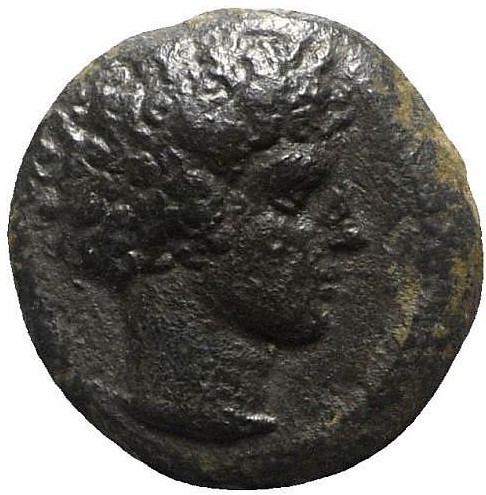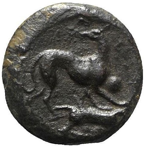 [EPYKINON] Hound running r., head l.; hare at feet, [above] and r. 2 pellets