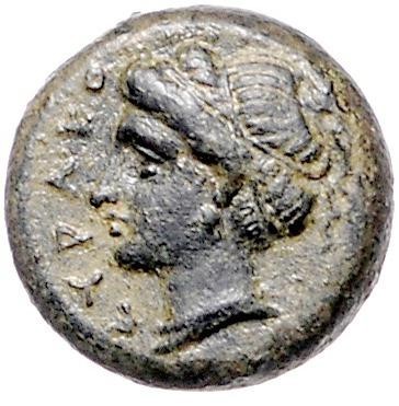 Weiblicher Kopf n.l.(Aphrodite, Persephone?), sie trägt dreifaches Ohrgehänge, ihr Haar mehrfach gebunden,dass oben ein kleiner Pferdeschwanz hervorkommt; davor ΣYPAKO[ΣIΩN]