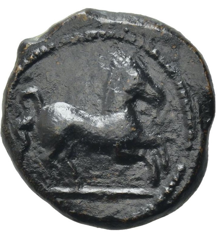 Horse on ex-line, galloping r., dotted border