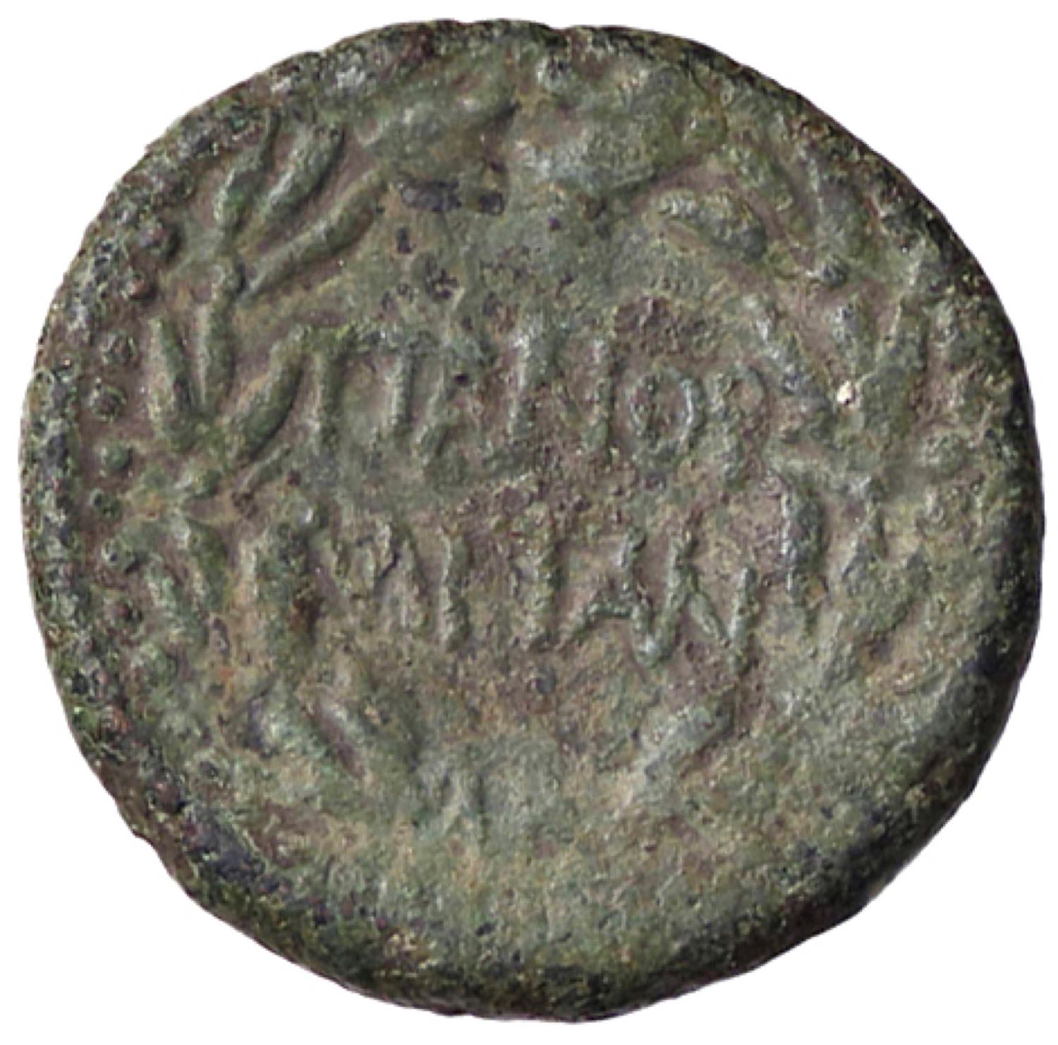 Lorbeerkranz, darin ΠANOP-MITAN in zwei Zeilen