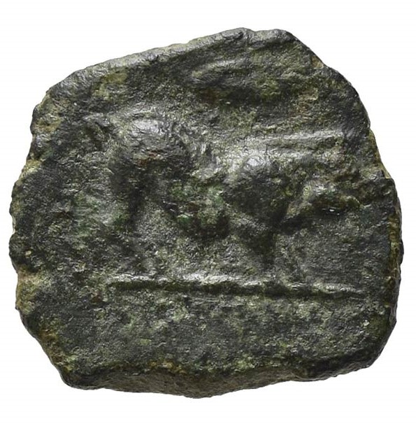 Boar standing r. on exline .; leaf(?) above