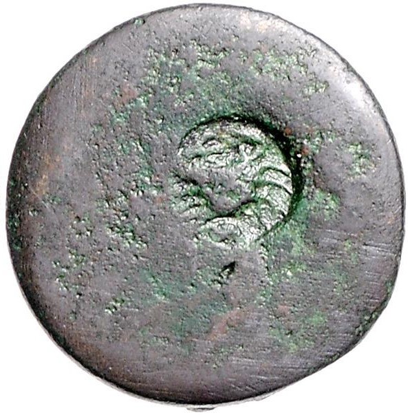 Auf älterer Münze großer Stempel – Kopf der Herakles n.r.