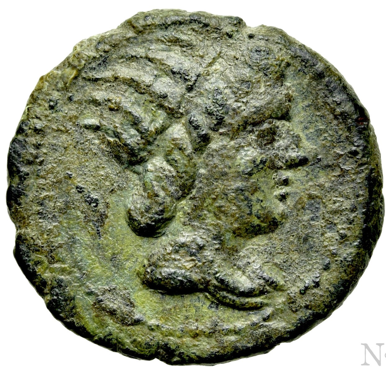 Kopf des Helios mit Strahlenkrone nach rechts; .Perlkreis