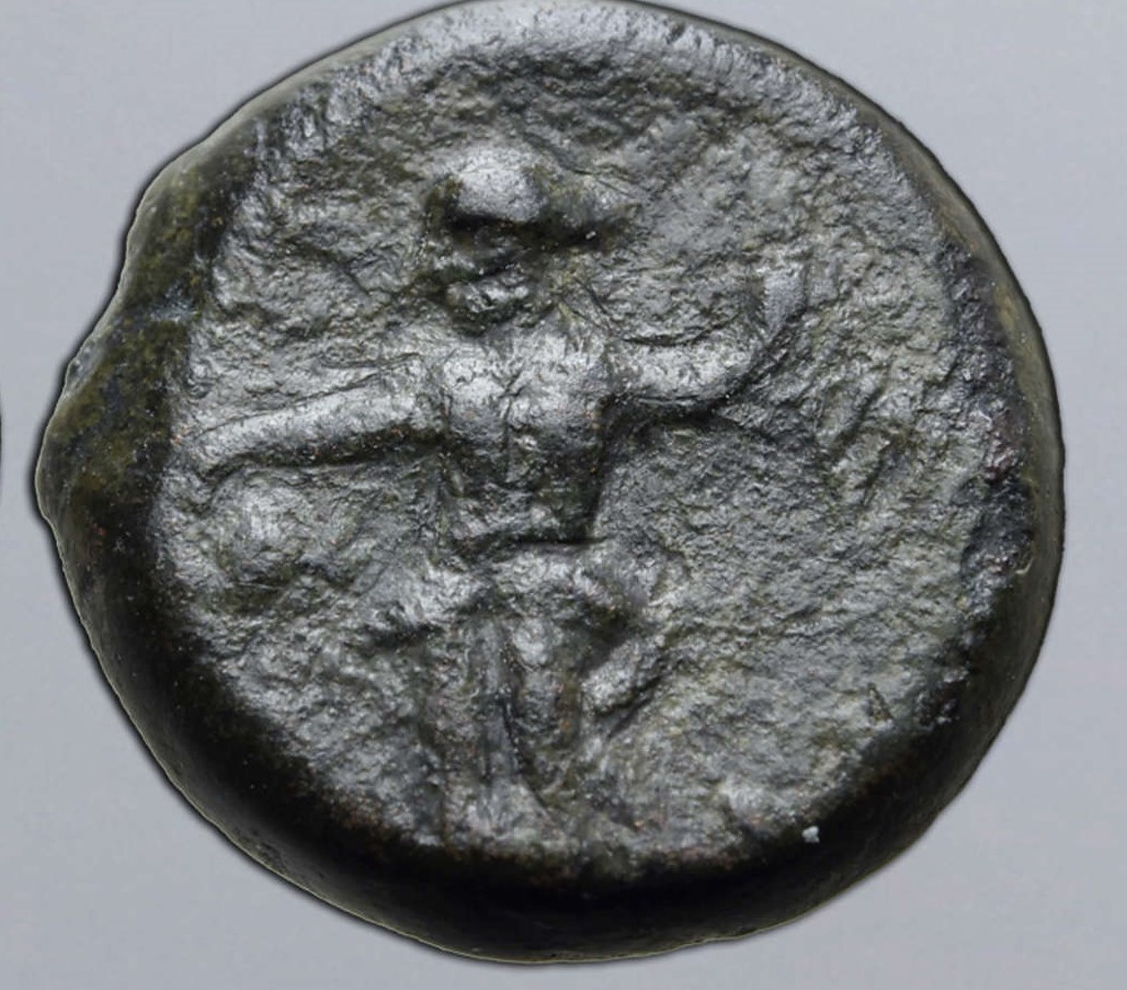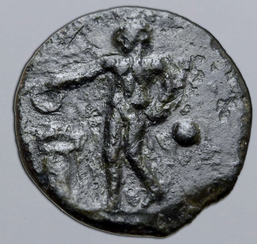 Nackter Mann steht nach l, hält mit seiner rechen Hand Phiale über Altar; rechts im Feld 1 Wertpunkt.