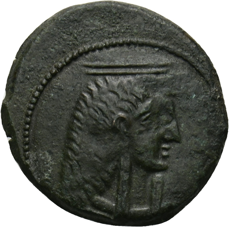 Bust of Isis right, with klaft and multiple necklace; dotted border