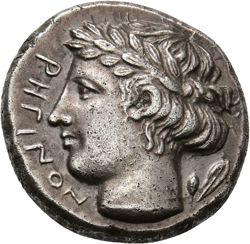 PHΓINΩN Kopf des Apollo n.l. mit Lorbeerkranz in kurzem Haar.; rechts Olivenzweig