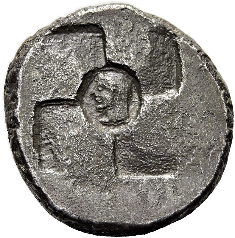 Head of Arethusa. Hair curving back from the forehead with dotted parallel lines and falling over neck, positioned in a circle sunk at the center of an incuse windmille like square