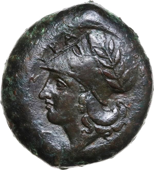 ΣYPA Head of Athena left, wearing Corinthiian helmet, wreathed in olive-leaves