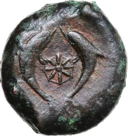 Zwei Delphine umschwimmen symmetrisch eine 8-strahlige Sternblüte