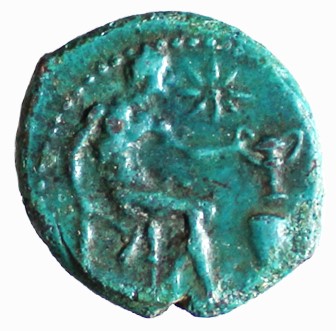 Hephaistos enthroned to right, holding hammer and kantharos; star in field