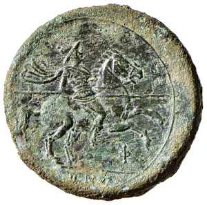 Reiter mit Helm und wehendem Mantel im Galopp n.r.; in der rechten Hand Lanze; im Feld r. Φ; im Abschnitt IEPΩNOΣ