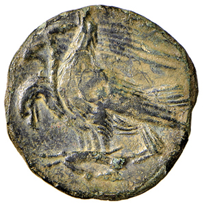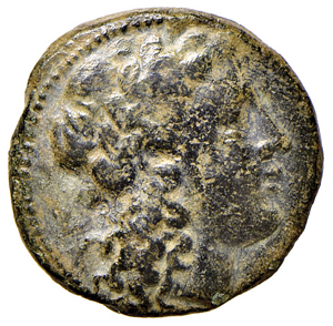 Kopf des Apollo mit Lorbeerkranz n.r.; Perlkreis
